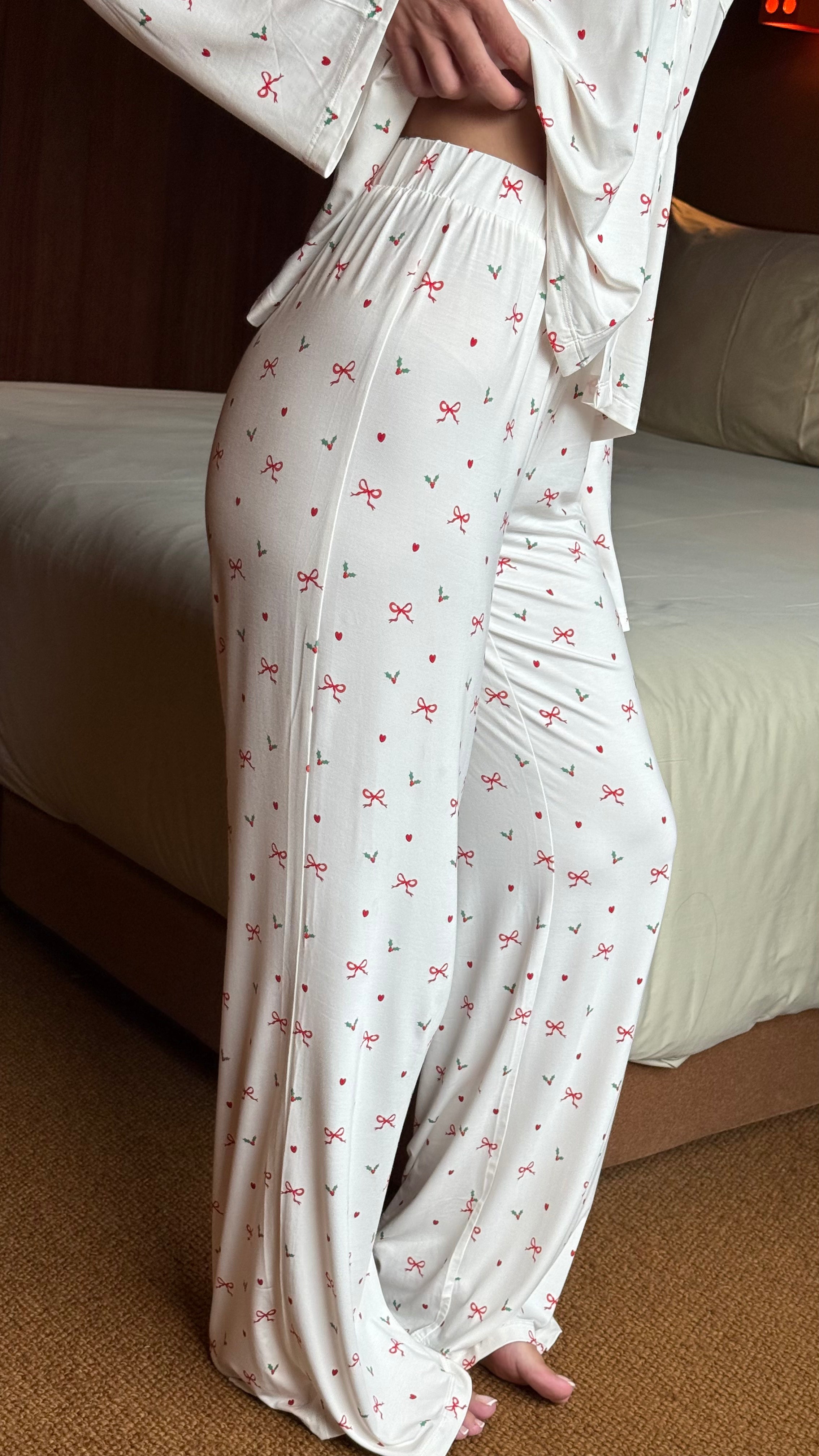 Our first-ever festive Pj that’s sure to take you back to the cozy nostalgia of childhood pjs with a creamy base and pops of the classic red and green festive colours. Designed with a breezy fit and the softest fabric, they're the perfect blend of style and comfort, designed to elevate your relaxation moments. Pair it with our matching Holly Pj Top for the full nostalgic look and feel.