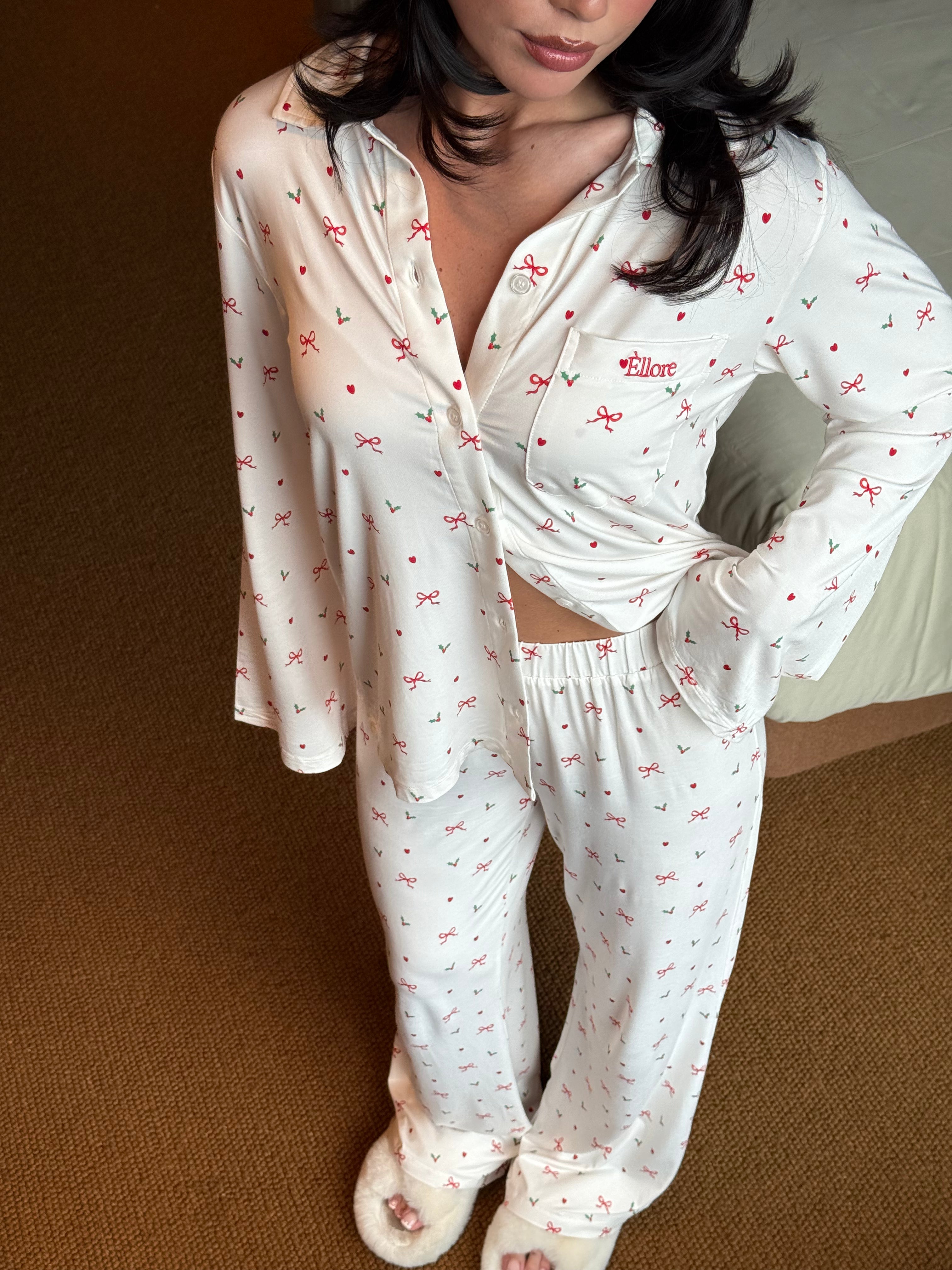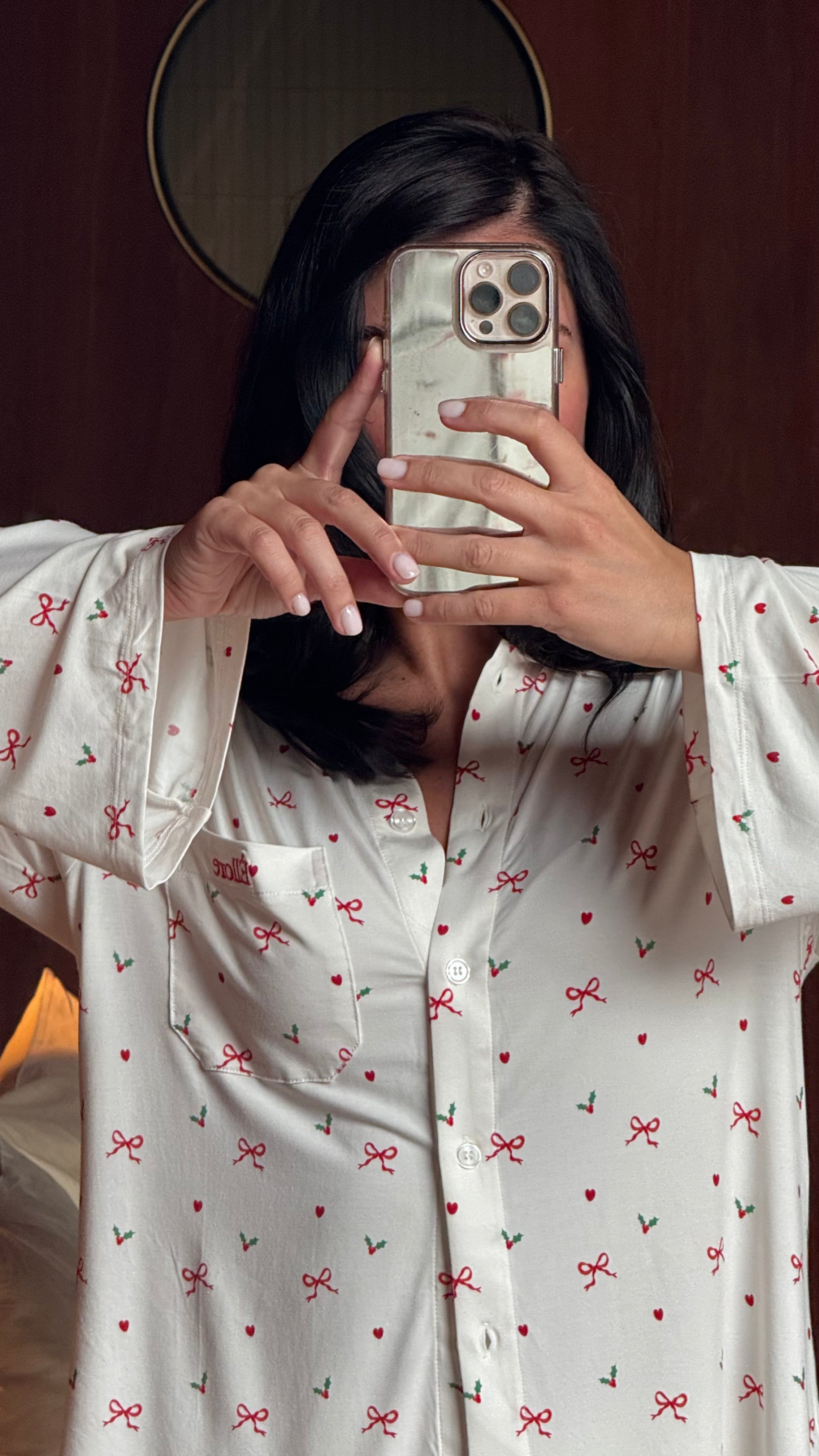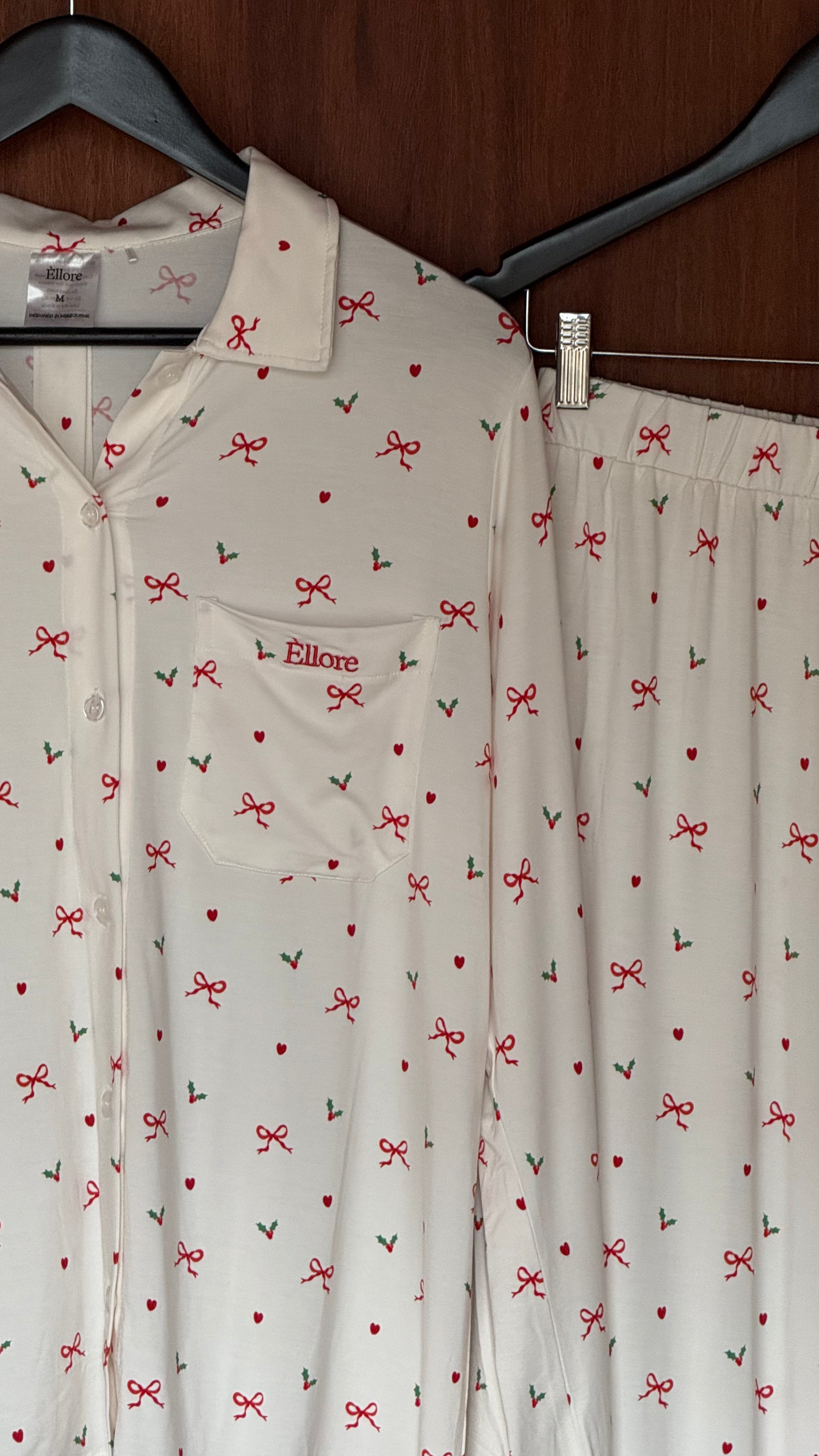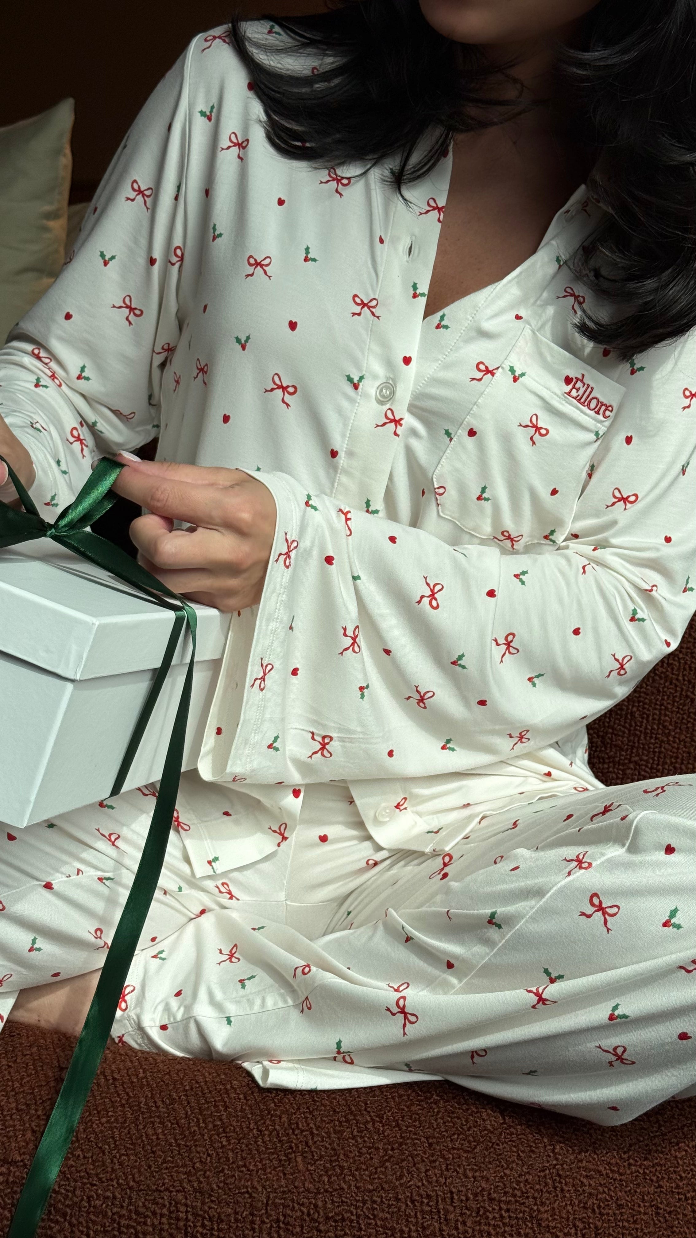 Our first-ever festive Pj that’s sure to take you back to the cozy nostalgia of your childhood pjs. Designed with a soft, creamy base and pops of the classic red and green festive colours. This pj set combines the warmth of cherished memories with a modern, girly twist. With dark red tones and delicate details, it’s the perfect mix of cute and cozy. Pair it with our matching Holly Pj Pants for the full nostalgic look and feel.