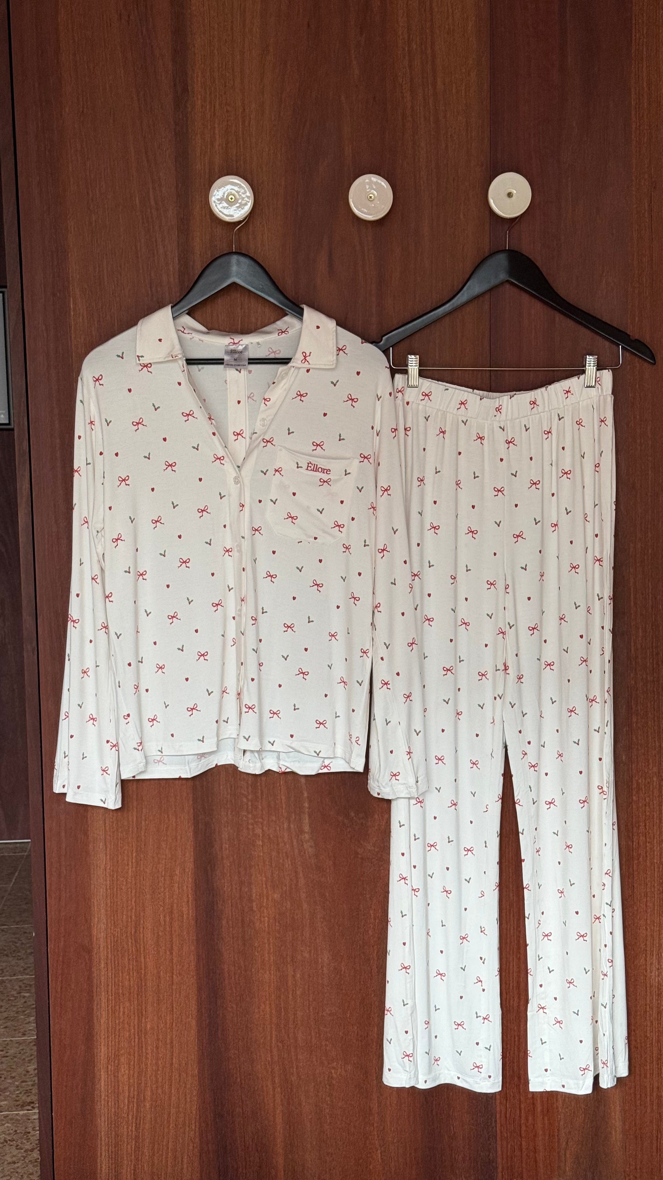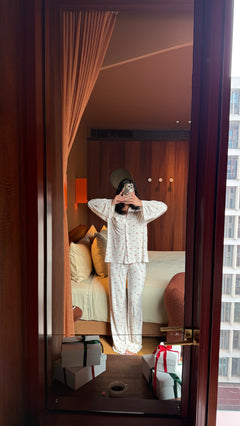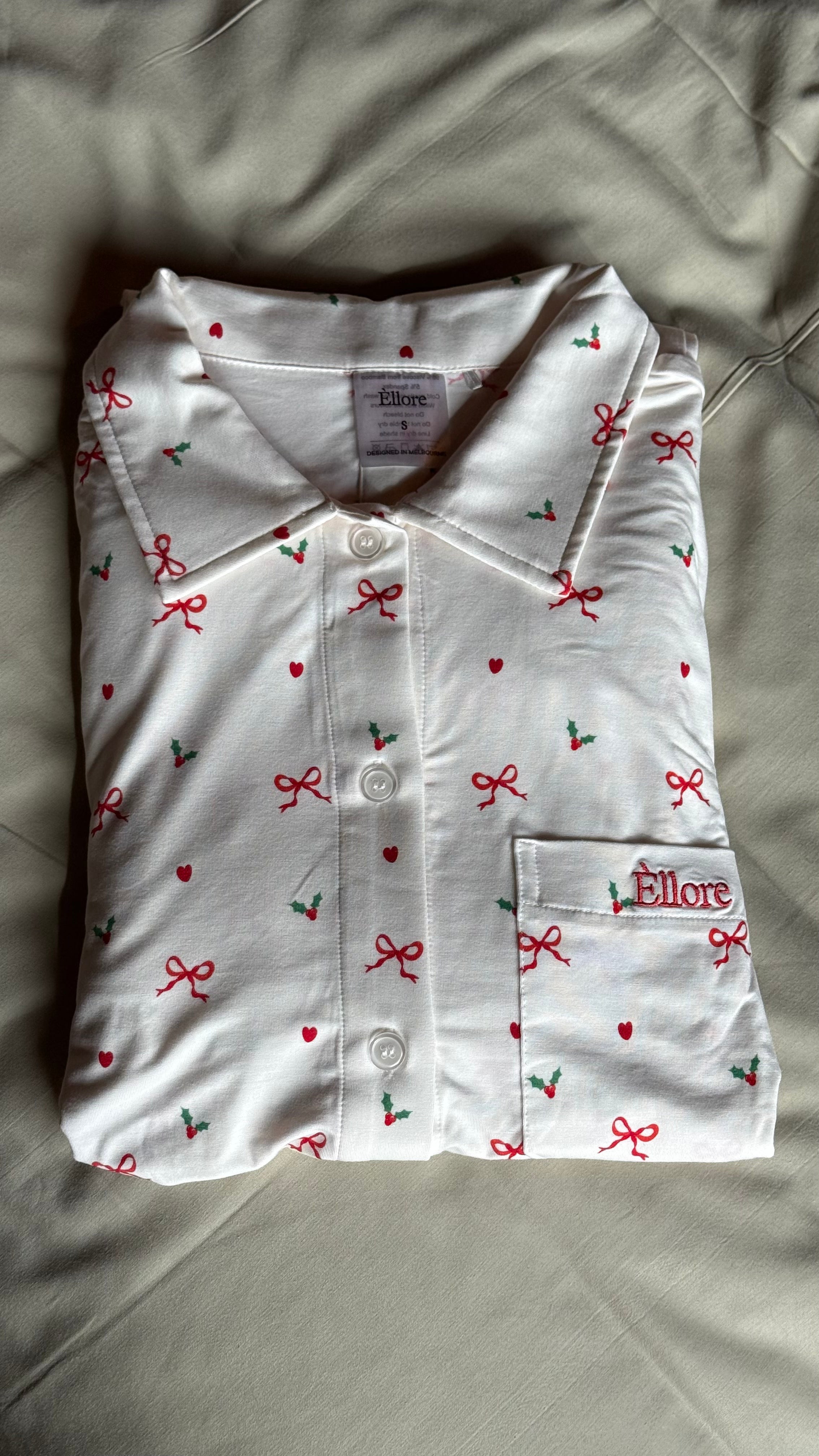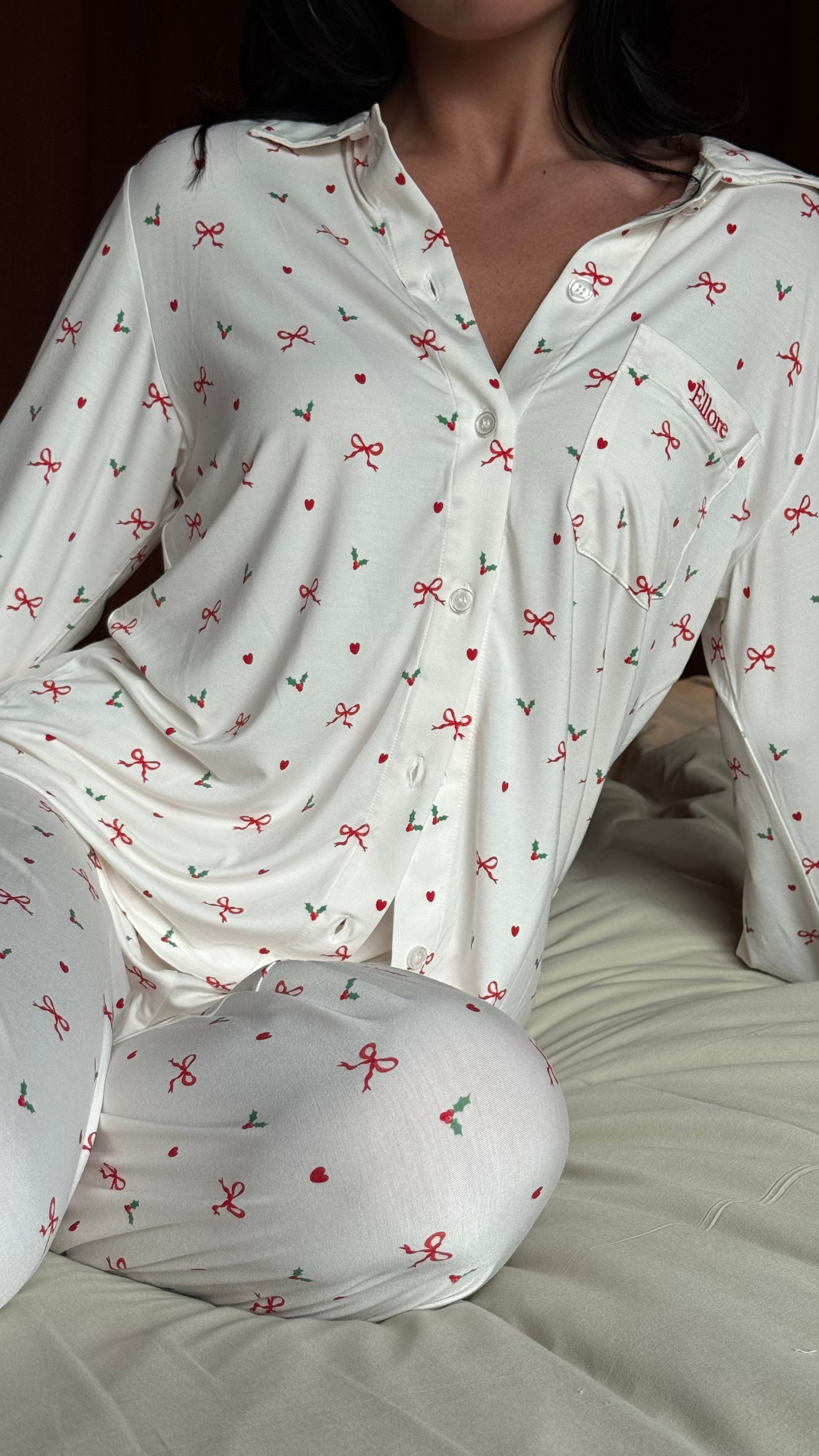 Our first-ever festive Pj that’s sure to take you back to the cozy nostalgia of your childhood pjs. Designed with a soft, creamy base and pops of the classic red and green festive colours. This pj set combines the warmth of cherished memories with a modern, girly twist. With dark red tones and delicate details, it’s the perfect mix of cute and cozy. Pair it with our matching Holly Pj Pants for the full nostalgic look and feel.